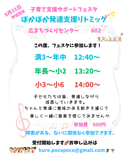 8月31日(日)に、呉市広の広まちづくりセンターで行われる「子育て支援サポートフェスタ」で、リトミックを行います。